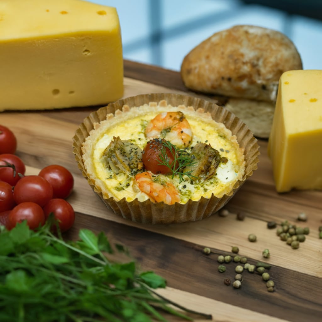 エビとホタテを白ワインとハーブで丁寧に蒸し焼きにし、クリームチーズとともに焼き上げた米粉キッシュが登場です。海の恵みがぎゅっと詰まったこの一品は、クリーミーなチーズとエビ・ホタテの旨みが絶妙に融合しています。グルテンフリーの生地で、安心して味わえるのもうれしいポイントです。
